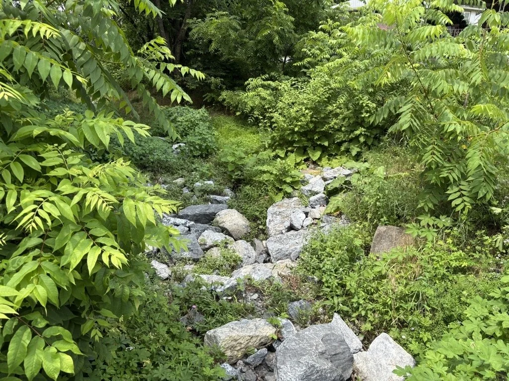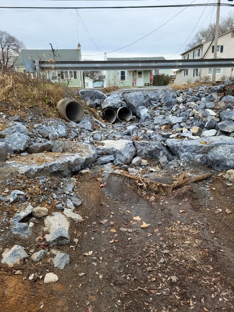 Below are the original conditions off of Lingle Avenue in Palmyra where the amount of water and rate of flow had created a deep path that offered no pollutant control.